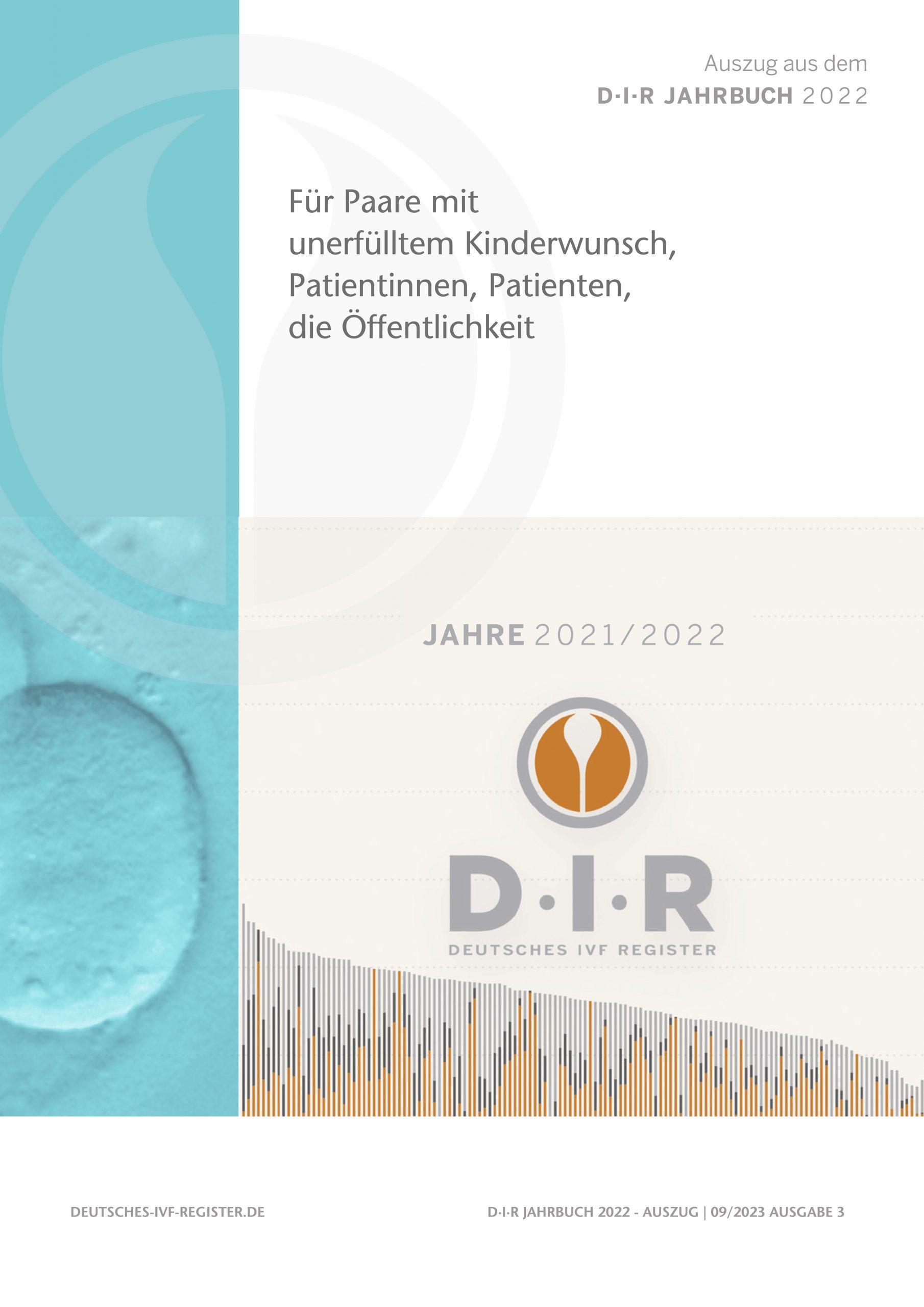 Auch in diesem Jahr findent man wieder eine Sonderausgabe als Auszug aus dem großen Jahrbuch 2022 des Deutschen IVF-Registers (D·I·R)®. Sie richtet sich an alle Paare mit einer ungewollten Kinderlosigkeit, an alle Paare, die aktuell in Kinderwunschbehandlung sind und auch allgemein an die interessierte Öffentlichkeit. In dieser Sonderausgabe haben wir die wichtigsten Eckdaten und aktuell wichtige Themen zusammengefasst und mit Erklärungen versehen.