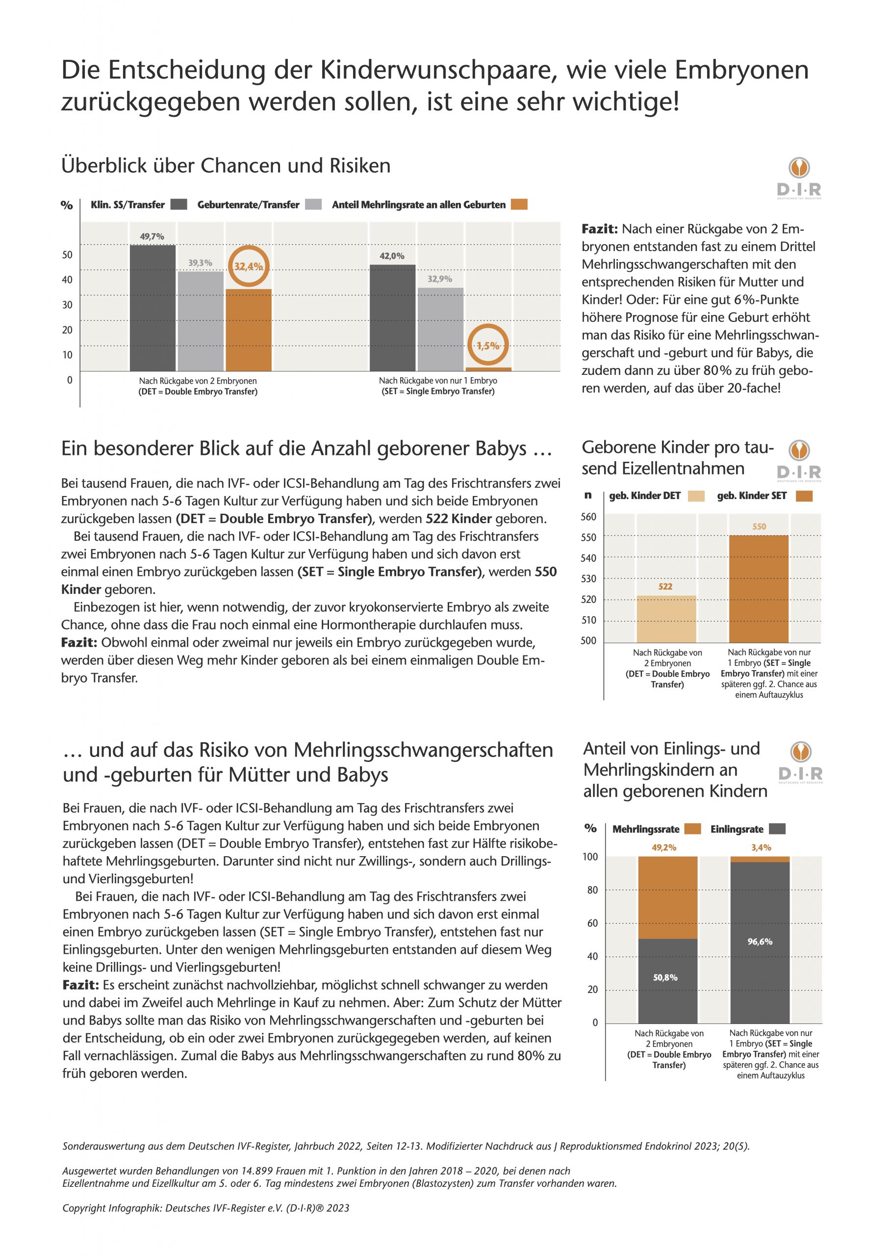 Weitere Informationen, Zahlen und Analysen bietet das Deutsche IVF-Register (D·I·R)® zum Beispiel in seinem aktuellen D·I·R Jahrbuch 2022, das am 22.09.2023 erschienen ist.